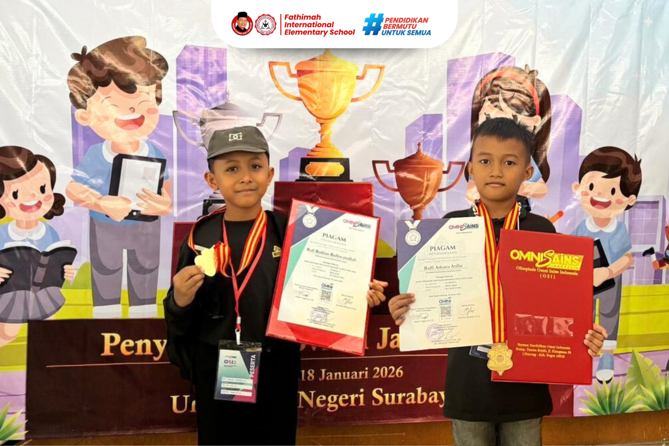 SUMENEP – Dua siswa Fathimah International Elementary School (FIES) Sumenep kembali mengharumkan nama sekolah melalui capaian prestasi. Rafi Rofdan Ridwanullah dan Raffi Arkana Arifin berhasil lolos ke grand final nasional Olimpiade OMNI Sains Indonesia 2025/2026.